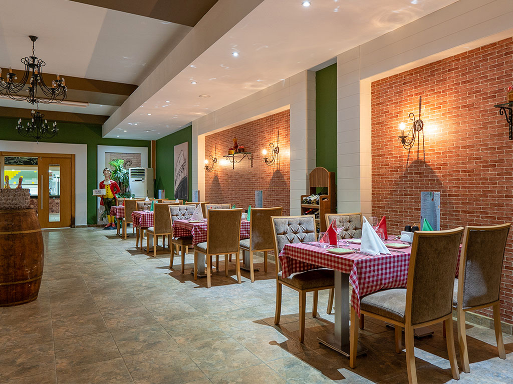 Pegasos World har tre temarestauranter å velge mellom: en tyrkisk, en italiensk og en asiatisk. En gang i uken kan du spise middag på en av disse uten ekstra kostnad og med forbehold om tilgjengelighet. Den asiatiske restauranten er ute og åpningstidene avhenger derfor av været.