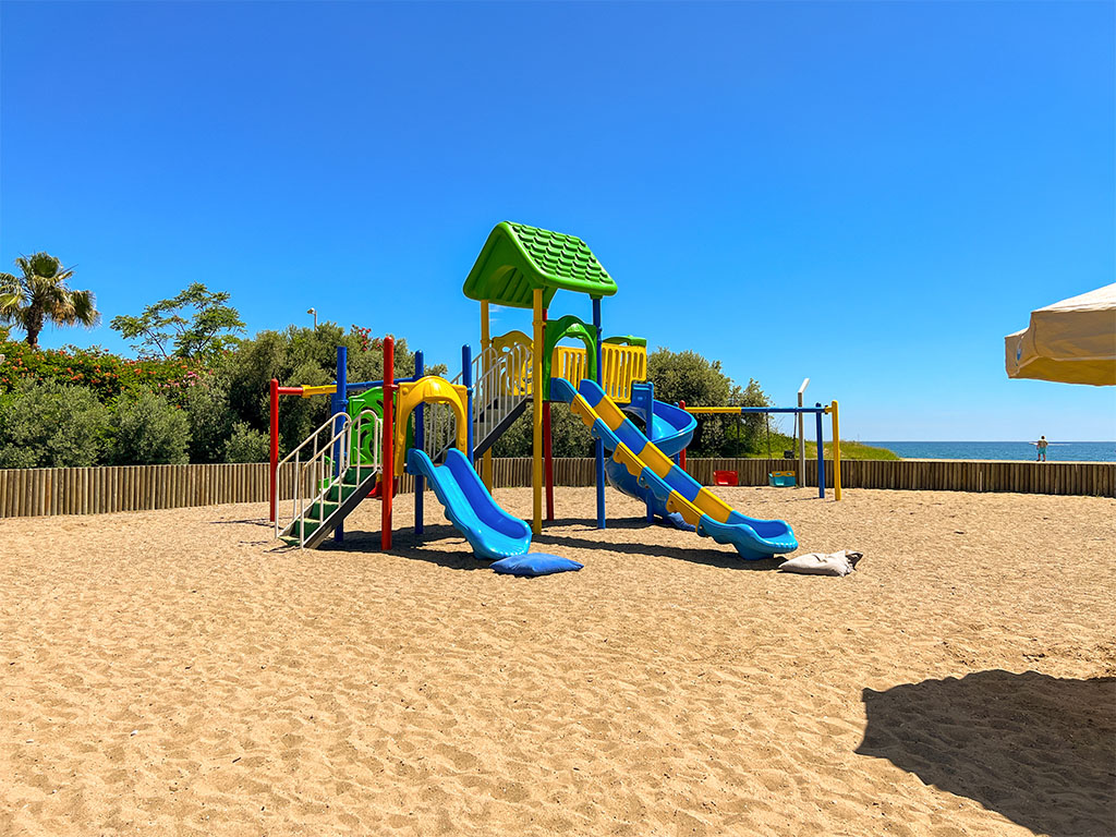 De blå bølgene i Middelhavet er bare et steinkast fra det store bassenget. Stiene ned til stranden går gjennom et grønt område omkranset av svaiende palmer. Hotellets eget strandområde er bredt og perfekt for å bygge sandslott!