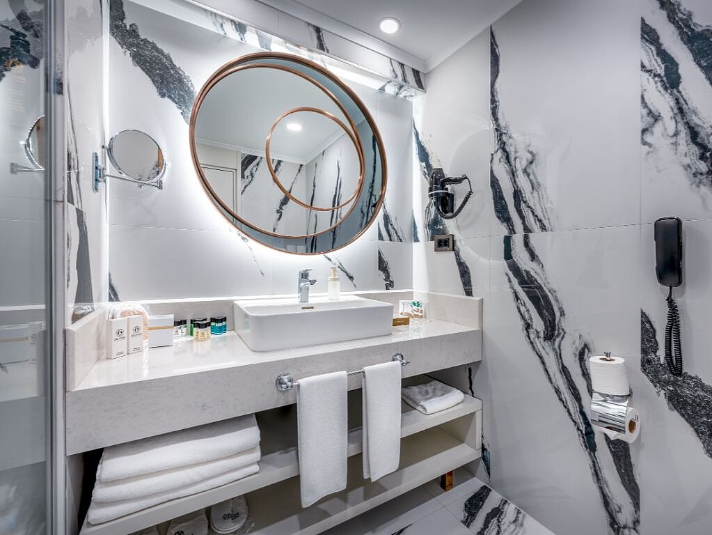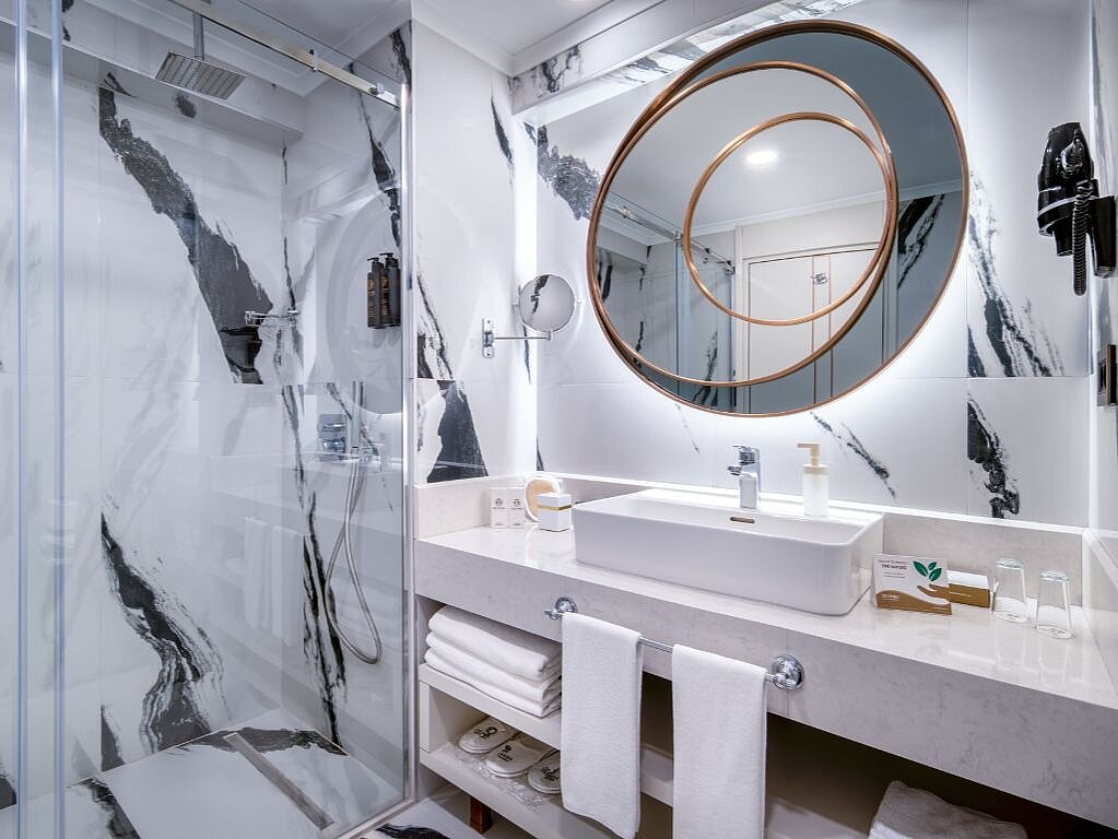 Alle rom har balkong, sentral luftkondisjonering, TV, safe, minibar som fylles opp daglig, laminatgulv eller fliser og vannkoker. På badene finnes dusjkabinett og hårføner. WiFi er kostnadsfritt på rommene.