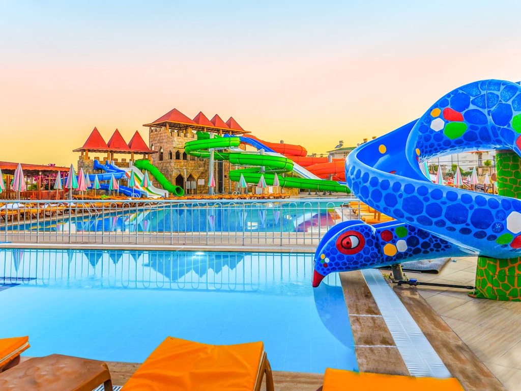 På Eftalia Villages hotellområde finnes et badeland med flere fartsfylte vannsklier, et noe roligere basseng for deg over 18 år og et stort aktivitetsbasseng med underholdning, musikk og morsomme aktiviteter.
