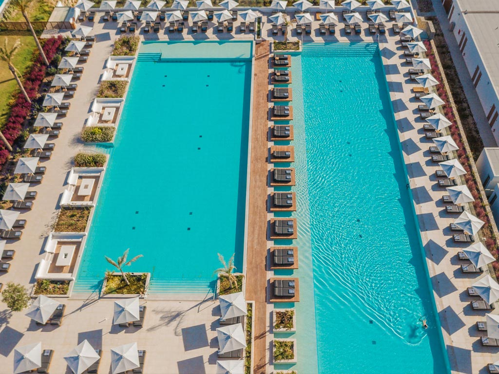 Hver enkelt parasoll ved bassengområdene har et unikt nummer og en QR-kode. Det betyr at du, med hjelp av en app du laster ned, kan bestille i hotellets barer direkte fra solsengen. Servitøren kommer siden ut med din bestilling til din plass.