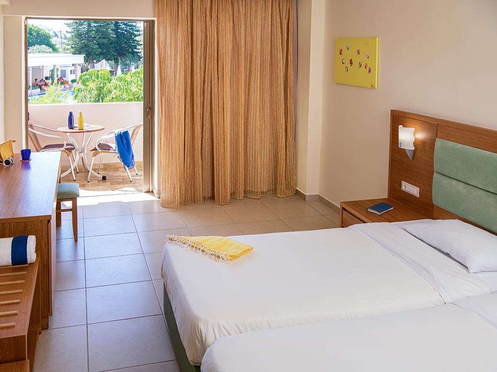 Ialyssos Bay har rom i varme og glade farger med en frisk og innbydende innredning både i bungalower og i hovedbygningen.