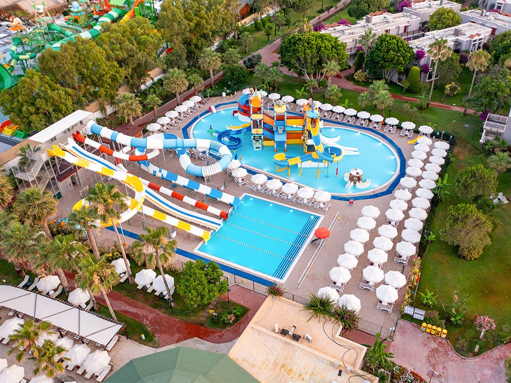 Fem bassenger. Dette hotellet har et barne- og babybasseng, et større aktivitetsbasseng og et roligere basseng eksklusivt for voksne. For de modige er det også ikke mindre enn ti vannsklier i det spennende og fargerike badelandet, hvorav fire er for større barn og voksne, og seks av disse er for de mindre barna.