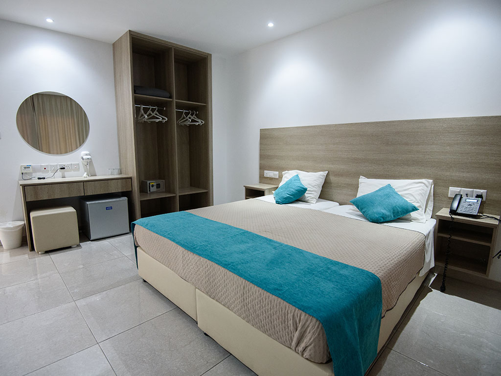 I dobbeltrommet på 20 m² finns to ordentlige sengeplasser. Rommet krever minst to fullt betalende, her kan maks. bo to voksne. Rommet kan bestilles med utsikt til land eller basseng mot et tillegg. Det kan også bestilles som enkeltrom mot et tillegg.