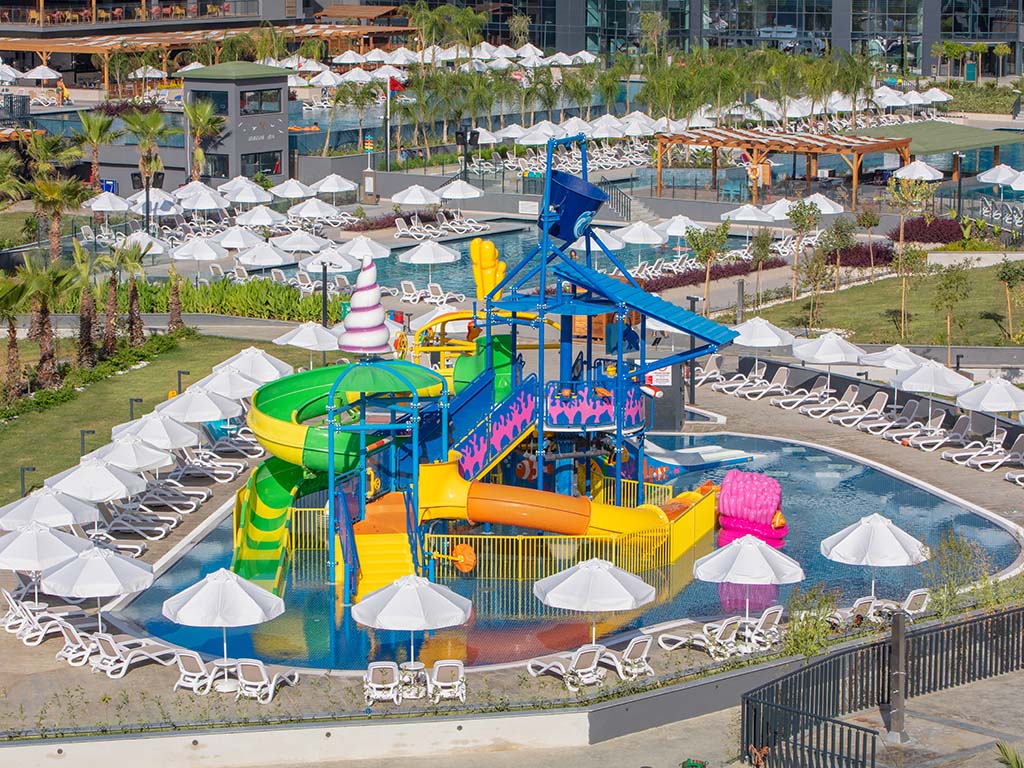På bassengområdet finner du et spennende badeland for barn og lekne voksne. Her finnes fem fargerike, større vannsklier, og et mindre plaskområde for de aller yngste barna. Barn kan også teste plaskområdet for litt større barn og bli godt nedskvettet.