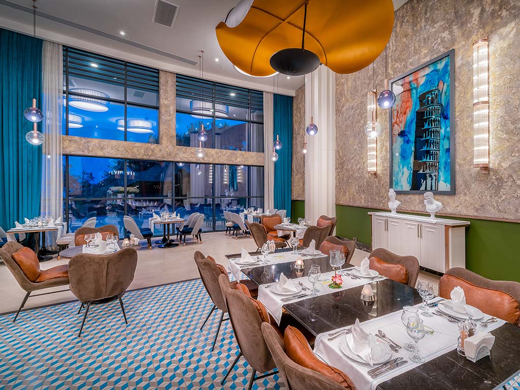 Hele fire. De stemningsfulle restaurantene i hovedbygningen tilbyr tyrkisk, asiatisk og italiensk mat, og nede ved vannet ligger en fiskerestaurant.
