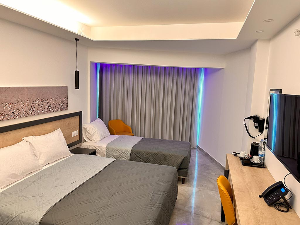Rommene på Papouis Hotel er enkle, moderne og friske og går i kjølige blå, grå og hvite nyanser. Alle rom har flisegulv.